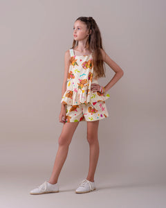 Com um fundo claro, esta peça exibe uma estampa lúdica de capivaras cercadas por elementos divertidos como corações e balões, criando um visual alegre e descontraído.