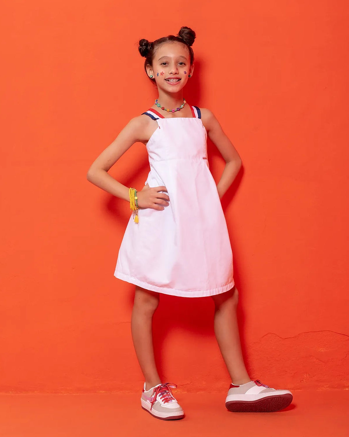 O fundo branco do vestido é o palco perfeito para destacar os detalhes coloridos, criando um visual que celebra a criatividade e a alegria da infância. Ideal para festas, passeios ou momentos especiais em família.