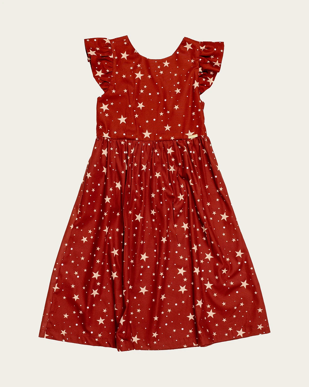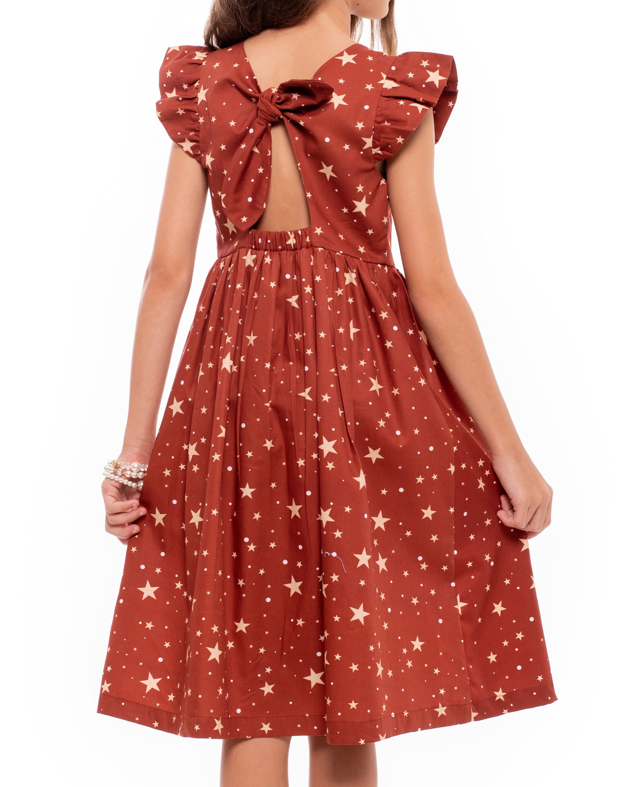 Com um toque lúdico, esta peça apresenta alças largas com delicados babados, trazendo um charme especial ao visual. A cintura levemente ajustada proporciona conforto, enquanto a saia ampla e solta permite liberdade de movimento, perfeita para as pequenas se divertirem. A estampa de estrelas brilha com sutileza, tornando-a uma escolha encantadora para diversas ocasiões.