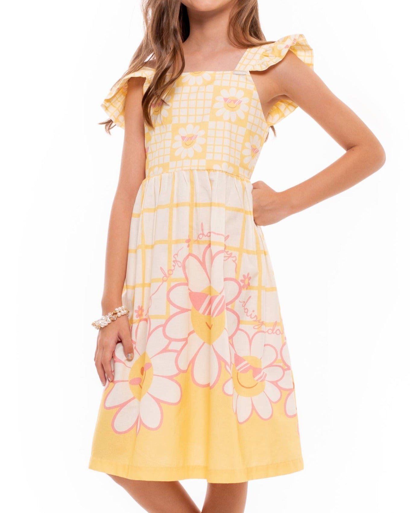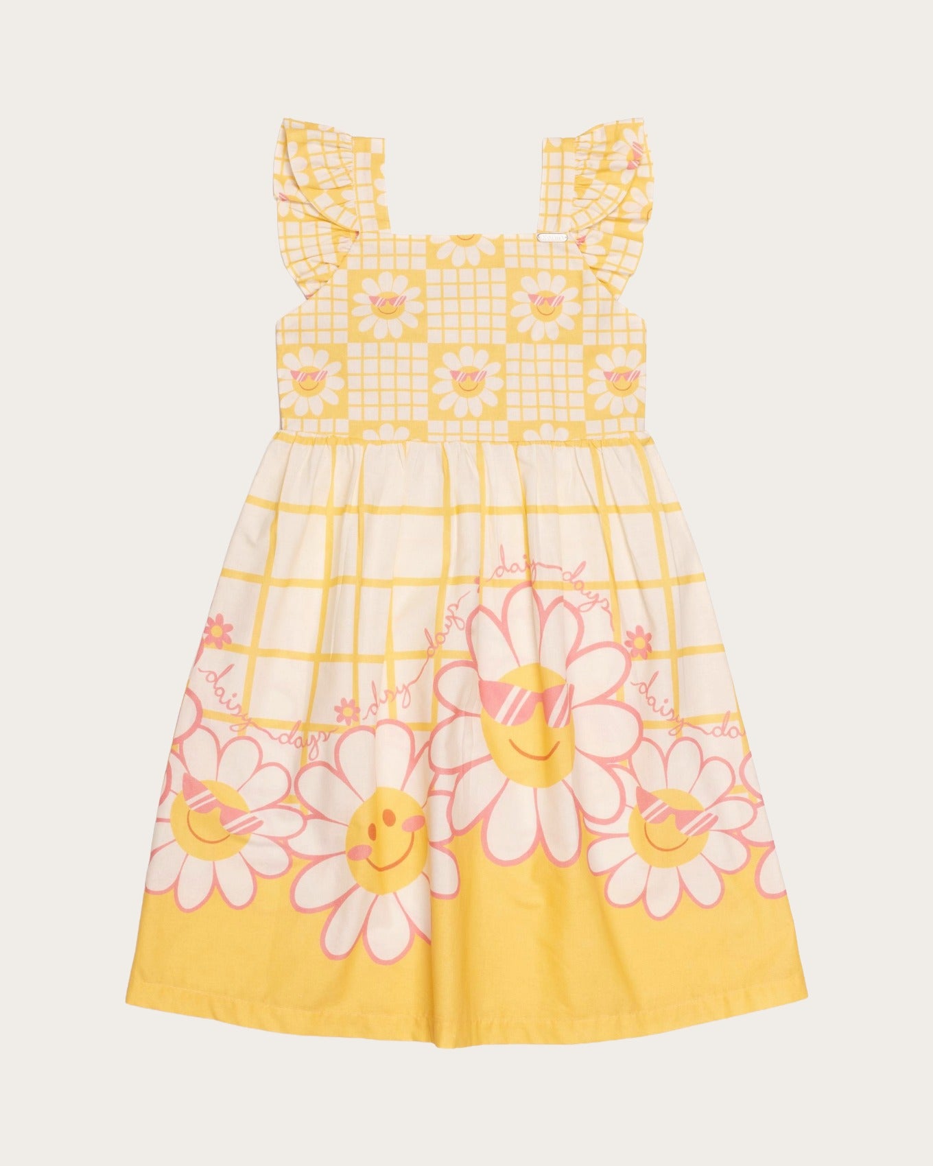 Vestido infantil amarelo com estampa floral e alças largas, detalhe em babados na barra