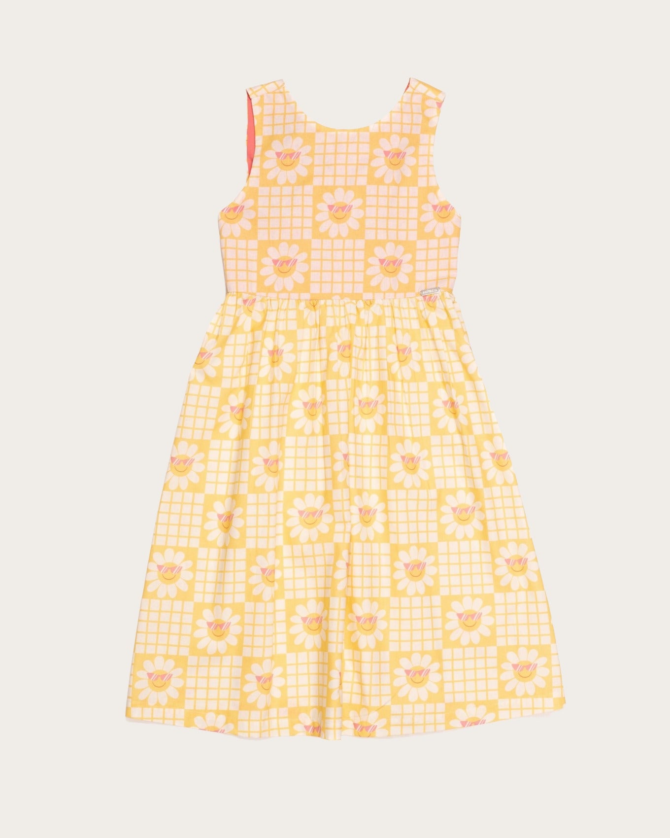 Vestido midi feminino infantil amarelo com estampa de flores grandes em padrão quadriculado