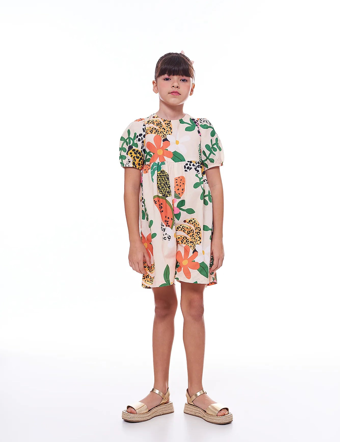 Vestido infantil com estampa de bananas e flores, mangas amplas e saia em camadas