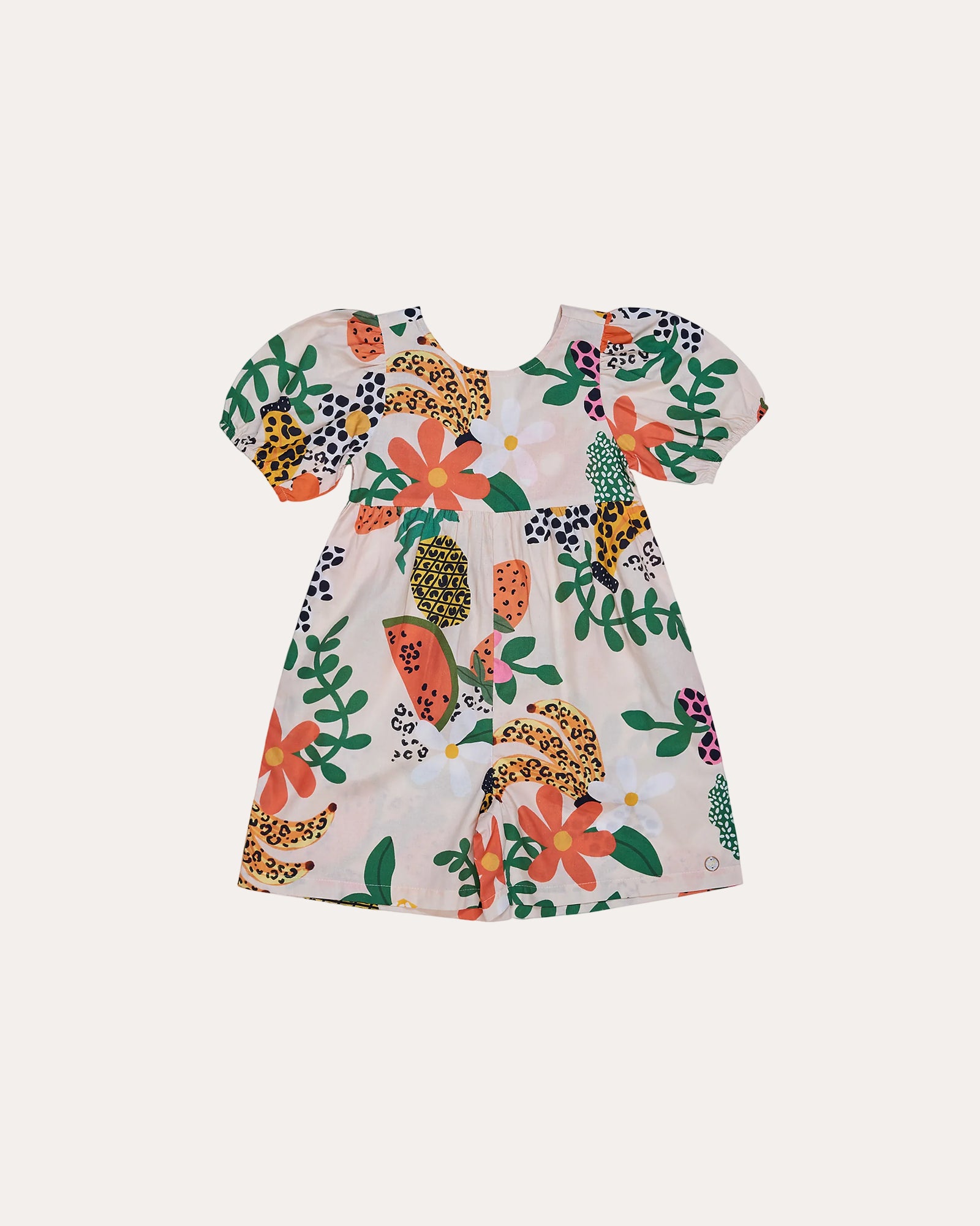 Macaco feminino infantil com estampa de bananas e flores em fundo rosa, detalhe de mangas amplas