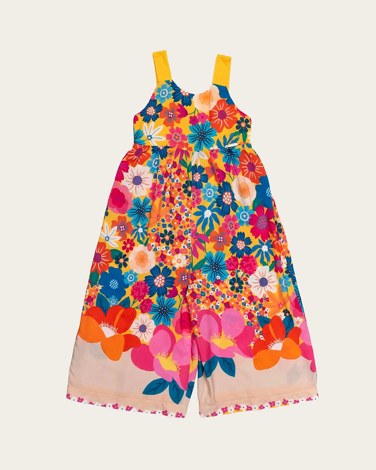 Macacão floral colorido com flores em tons vibrantes e alças largas, feminino infantil