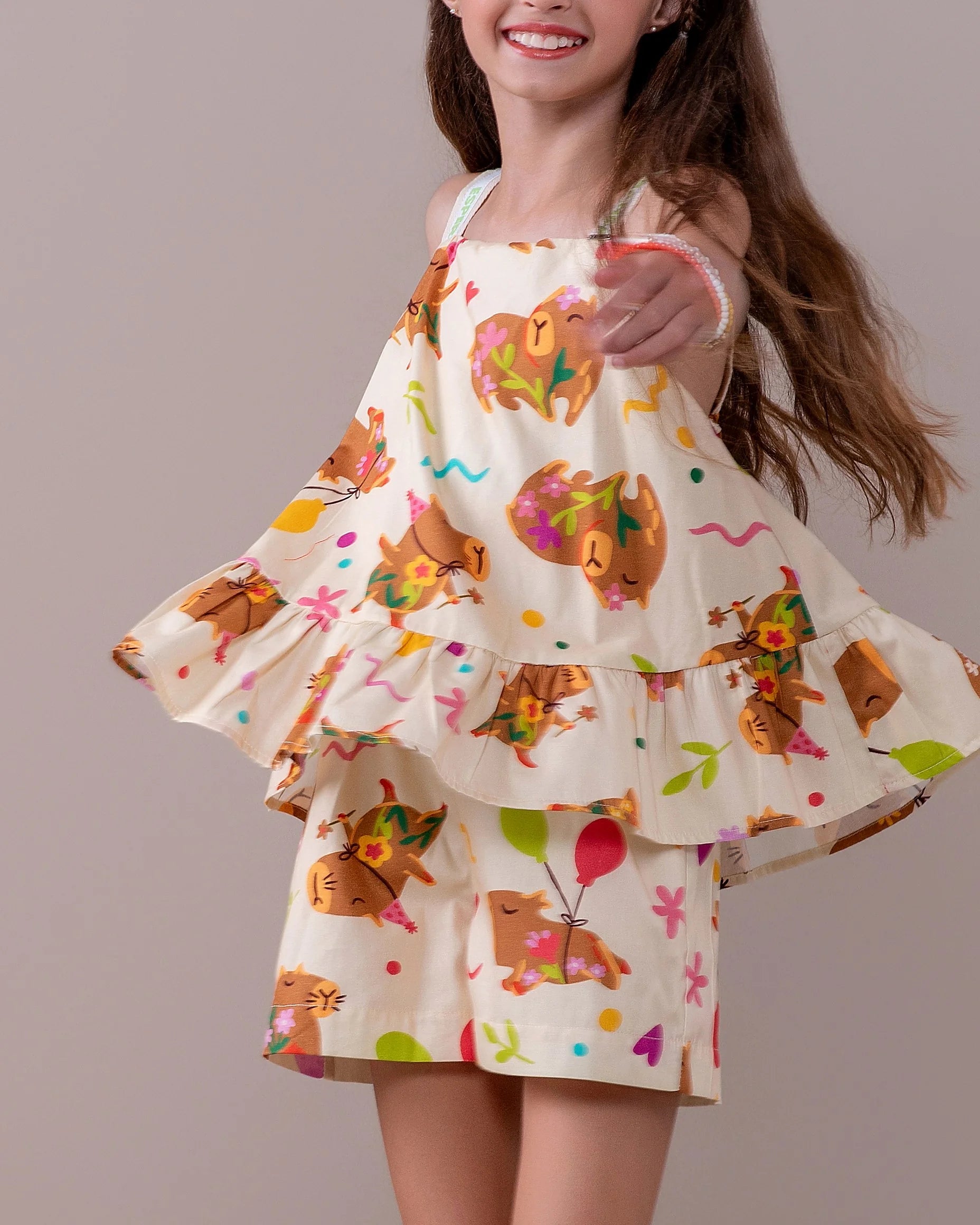 Macacão infantil com estampa de capivaras e flores, alças largas e camadas na parte inferior