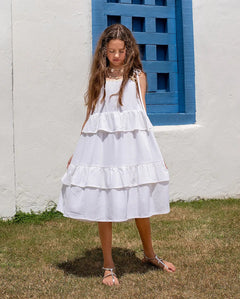 Conjunto feminino infantil com blusa de alças e saia rodada brancas, detalhes em babados