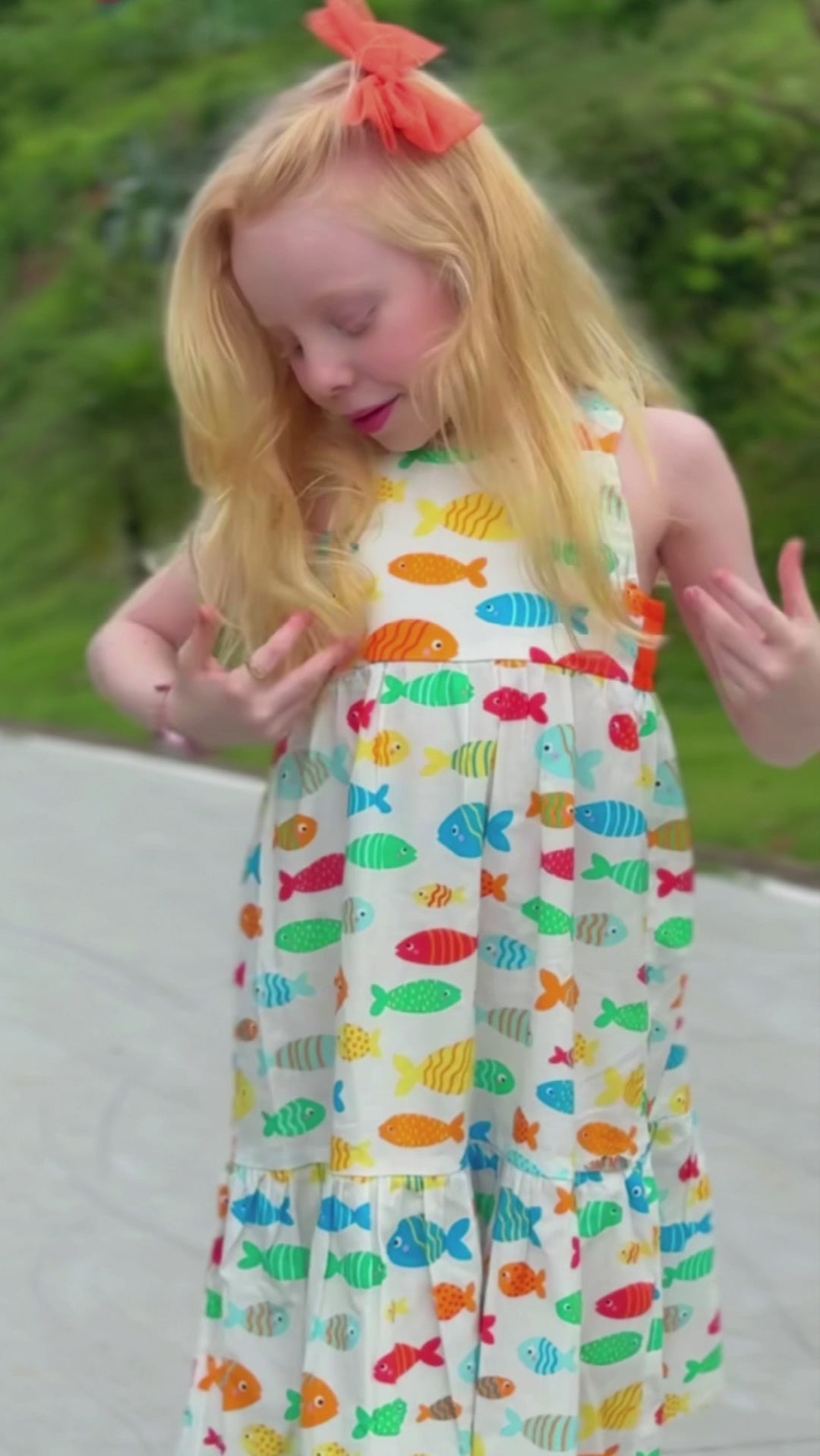 Este vestido traz um toque divertido com sua estampa vibrante de peixes coloridos, em tons de laranja, azul e amarelo, que encantam e estimulam a imaginação.